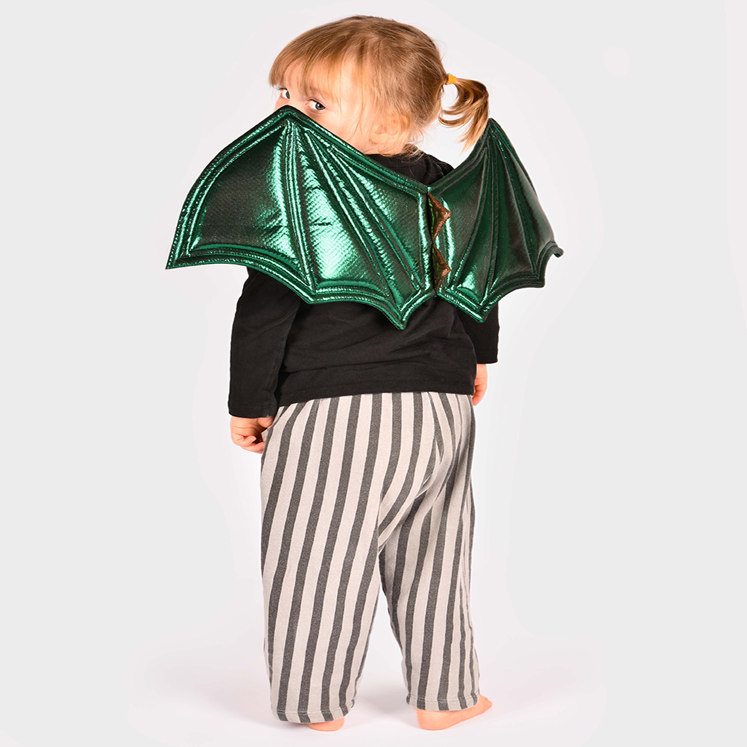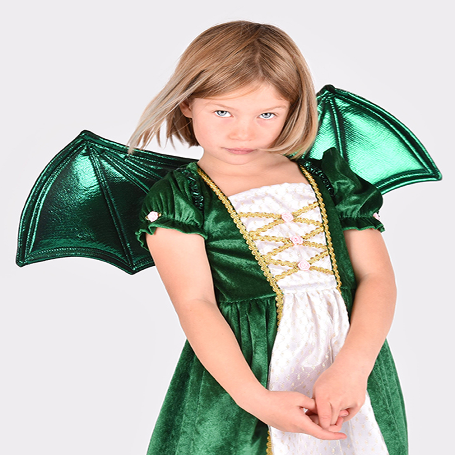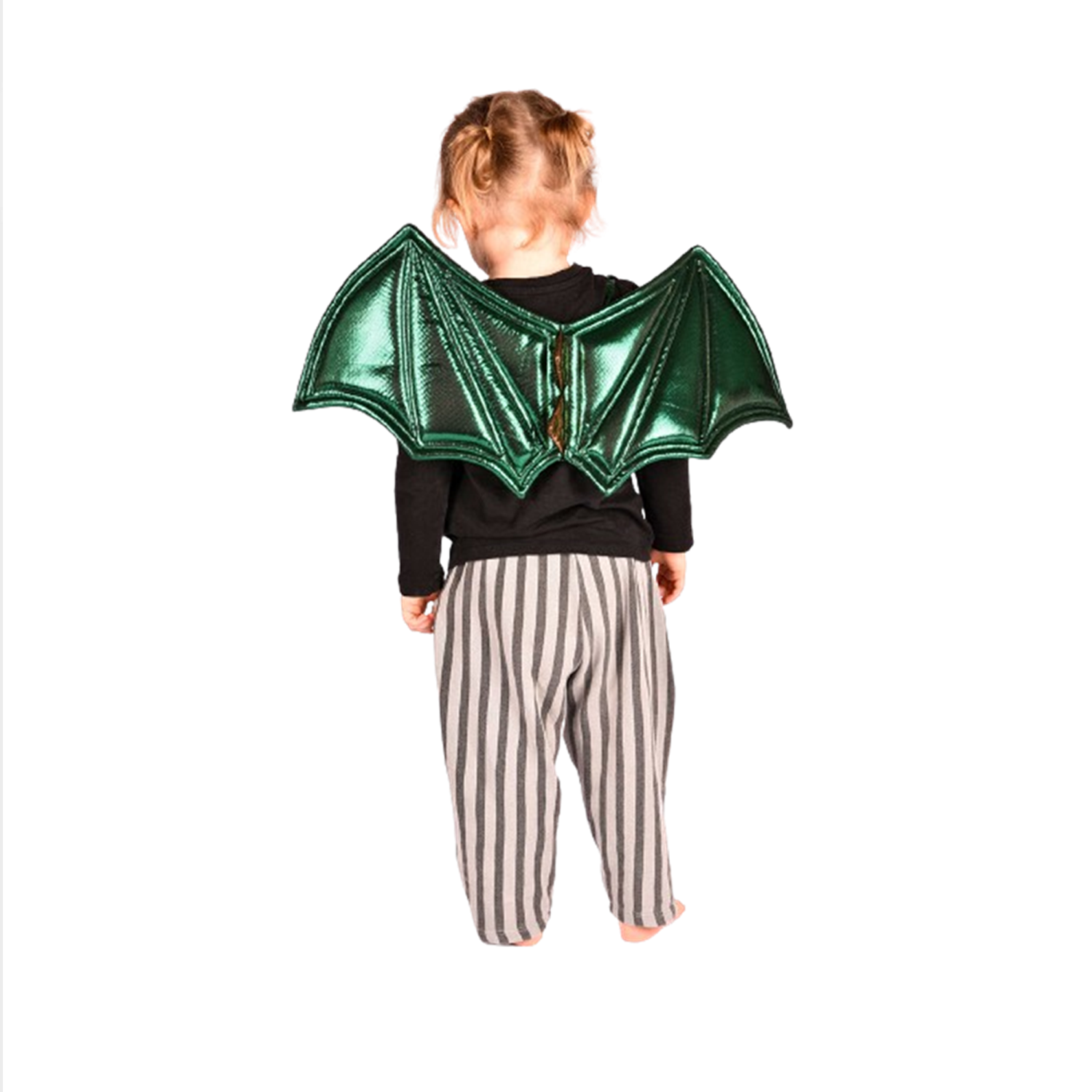 Alas de dragón en color verde metalizado con púas doradas y correas elásticas ideales para incluirlas con cualquier disfraz de la marca Den Goda Fen.
