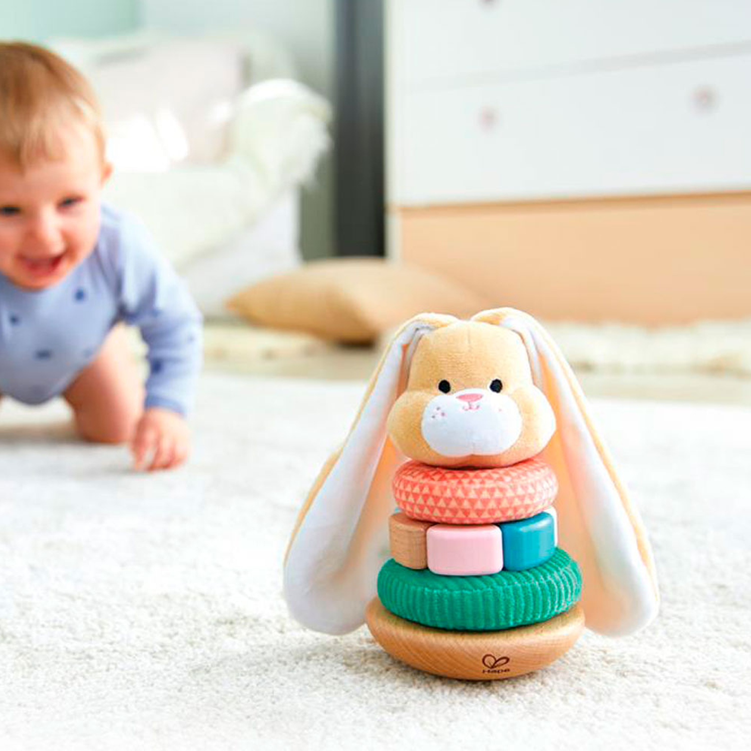 Esta pirámide de apilar tiene diferentes texturas en cada disco, creando una experiencia sensorial con tela y madera para estimular el tacto en los más peques.