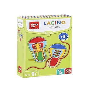 Cada juego contiene 4 fichas (2 pares) en forma de zapato y 4 cuerdas de diferentes colores.