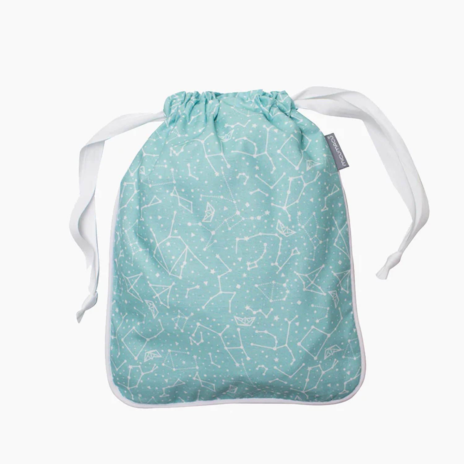 Práctica bolsa con nuestro print Micumacu de constelación mint en tonos pastel que acompañará a tu hij@ para que disfrute de una original merienda, fabricada en tela de algodón y con forro interior. Práctico cierre con cordón.
