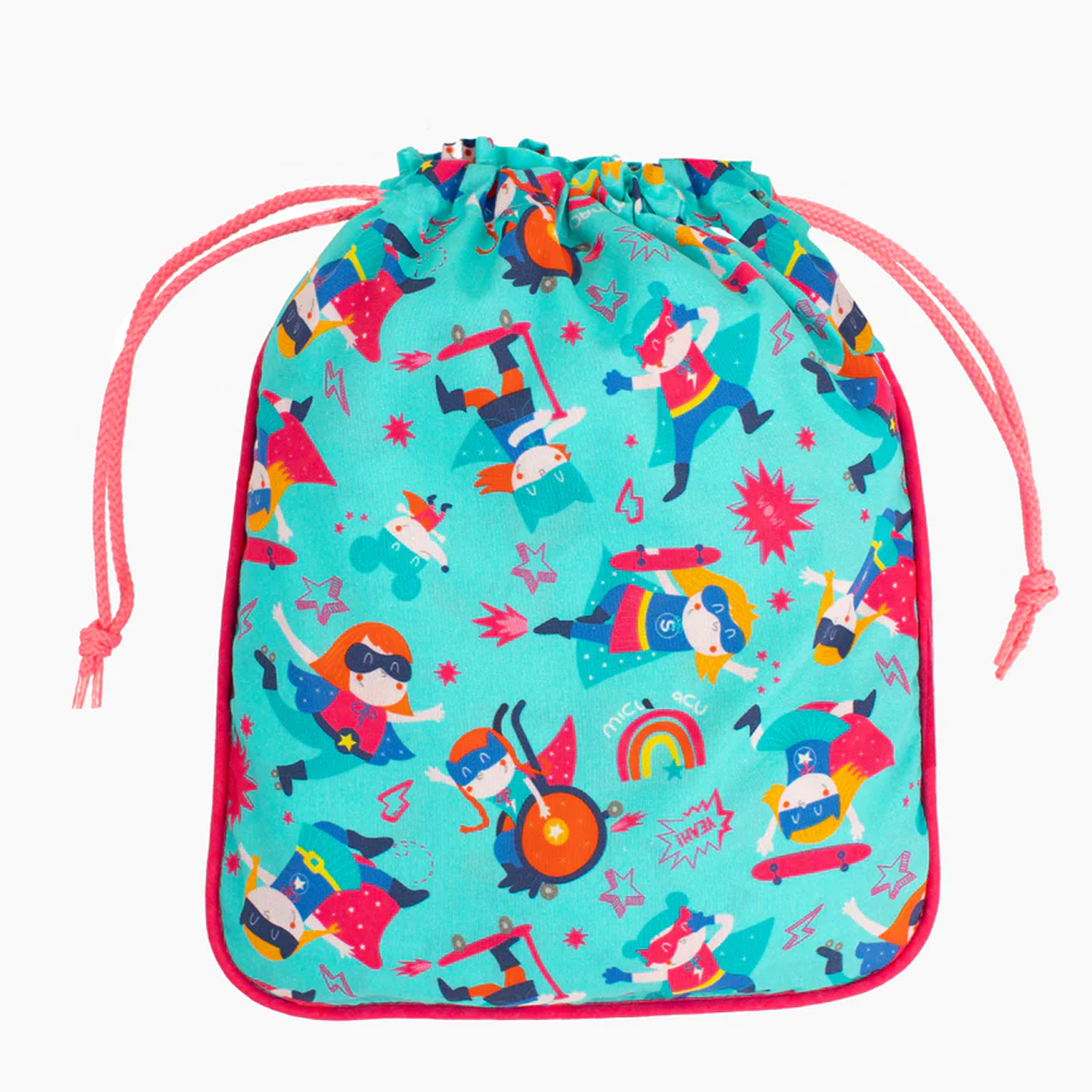 Esta bolsita lleva nuestro divertido estampado Power y es perfecta para llevar la merienda o el desayuno. Es de algodón y tiene forro en el interior.