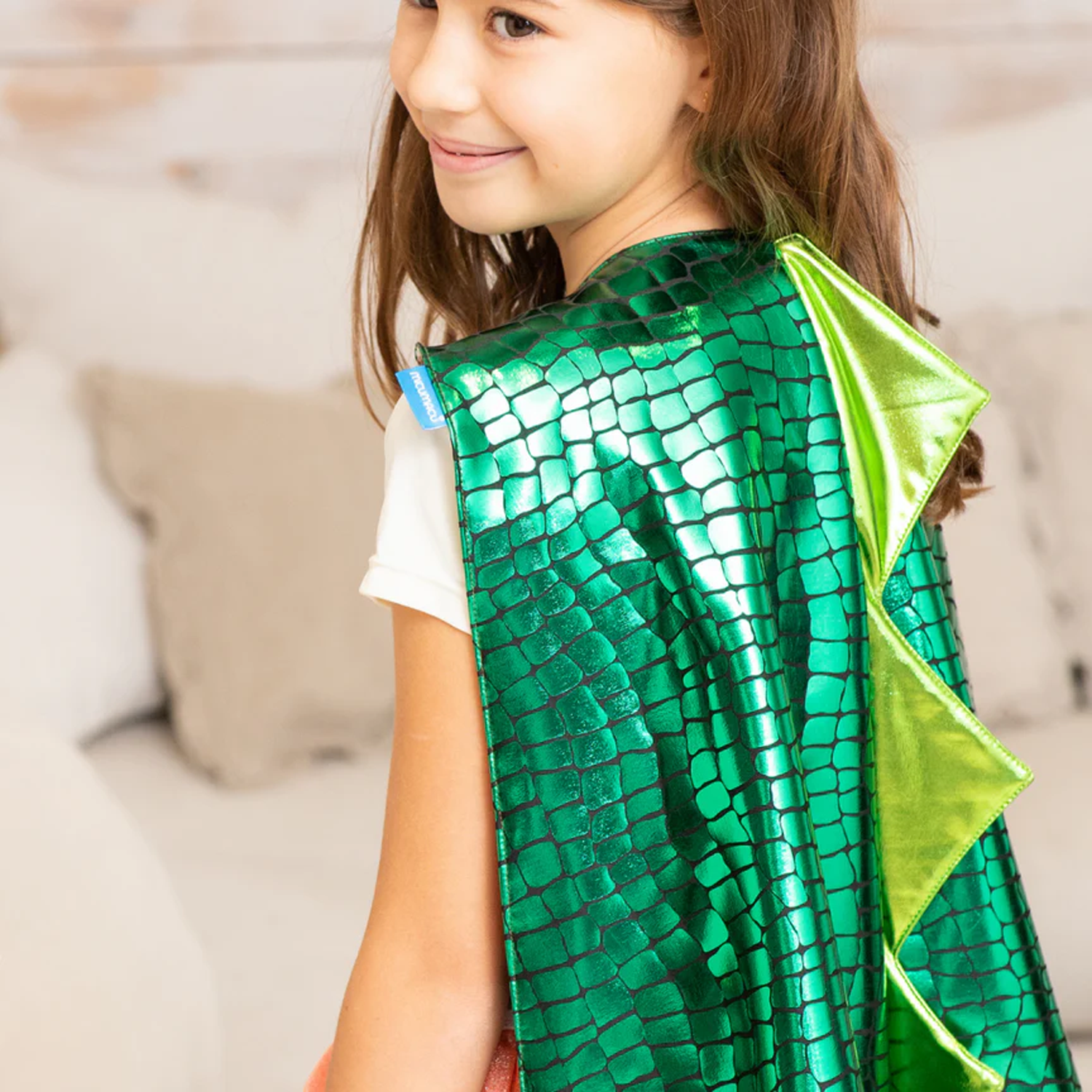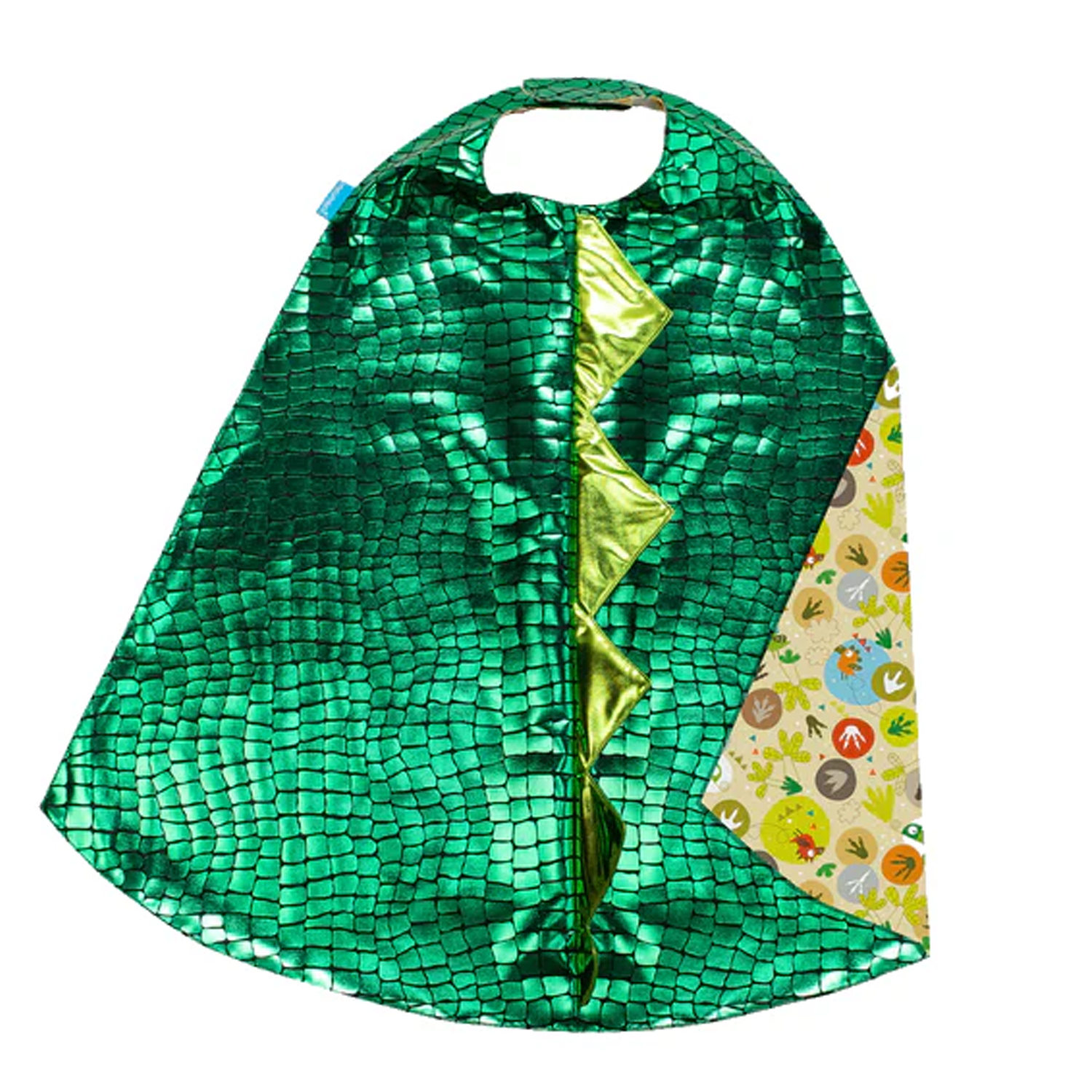 Divertida y cómoda capa de superhéroe de dinosaurio en verde metalizado y crestas acolchadas. Interior con nuestro tejido de huellas de dinosaurio. Utilízala de manera reversible. ¡Tus hijos desarrollaran su imaginación y se lo pasaran en grande!