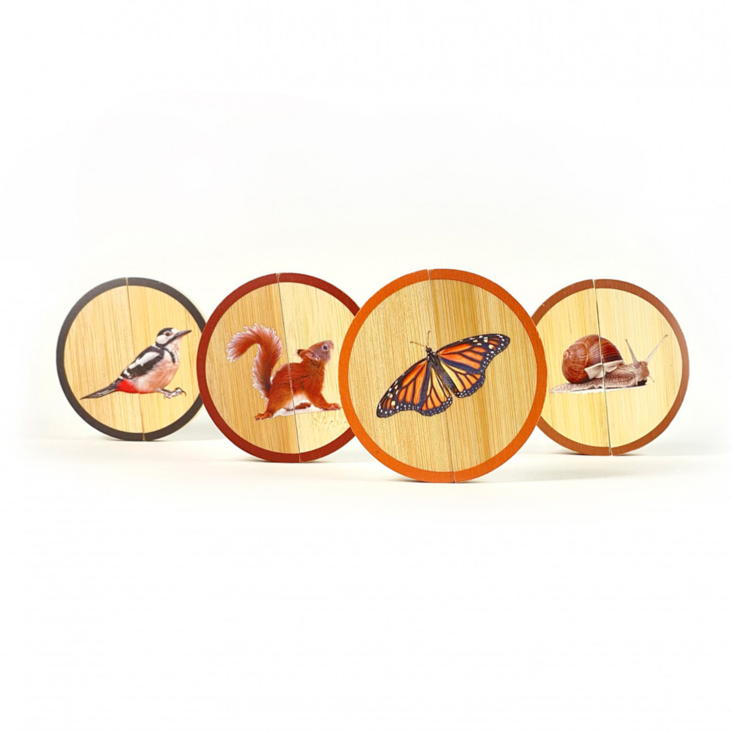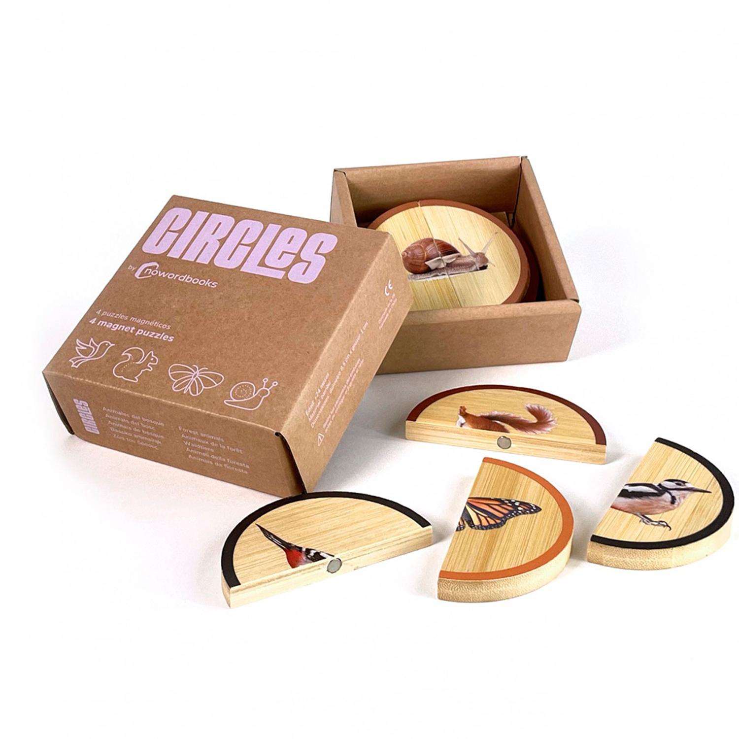 Animales Salvajes contiene cuatro pequeños rompecabezas formados por dos piezas magnéticas de los siguientes animales: Pájaro, Ardilla, Mariposa y Caracol.