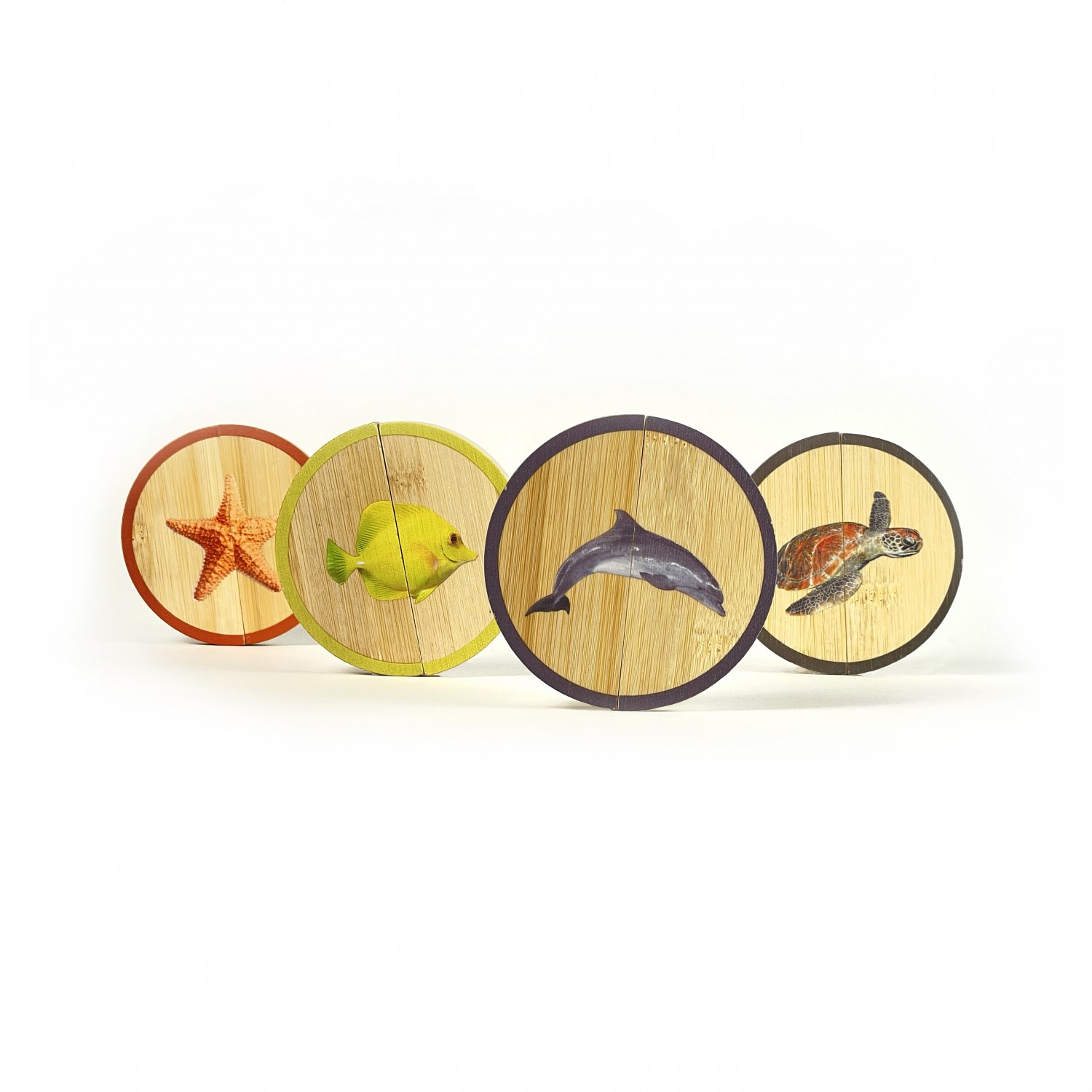 Los Circles de Animales Marinos contiene cuatro pequeños rompecabezas formados por dos piezas magnéticas de los siguientes animales: Delfín, Tortuga, Pez y Estrella de Mar.