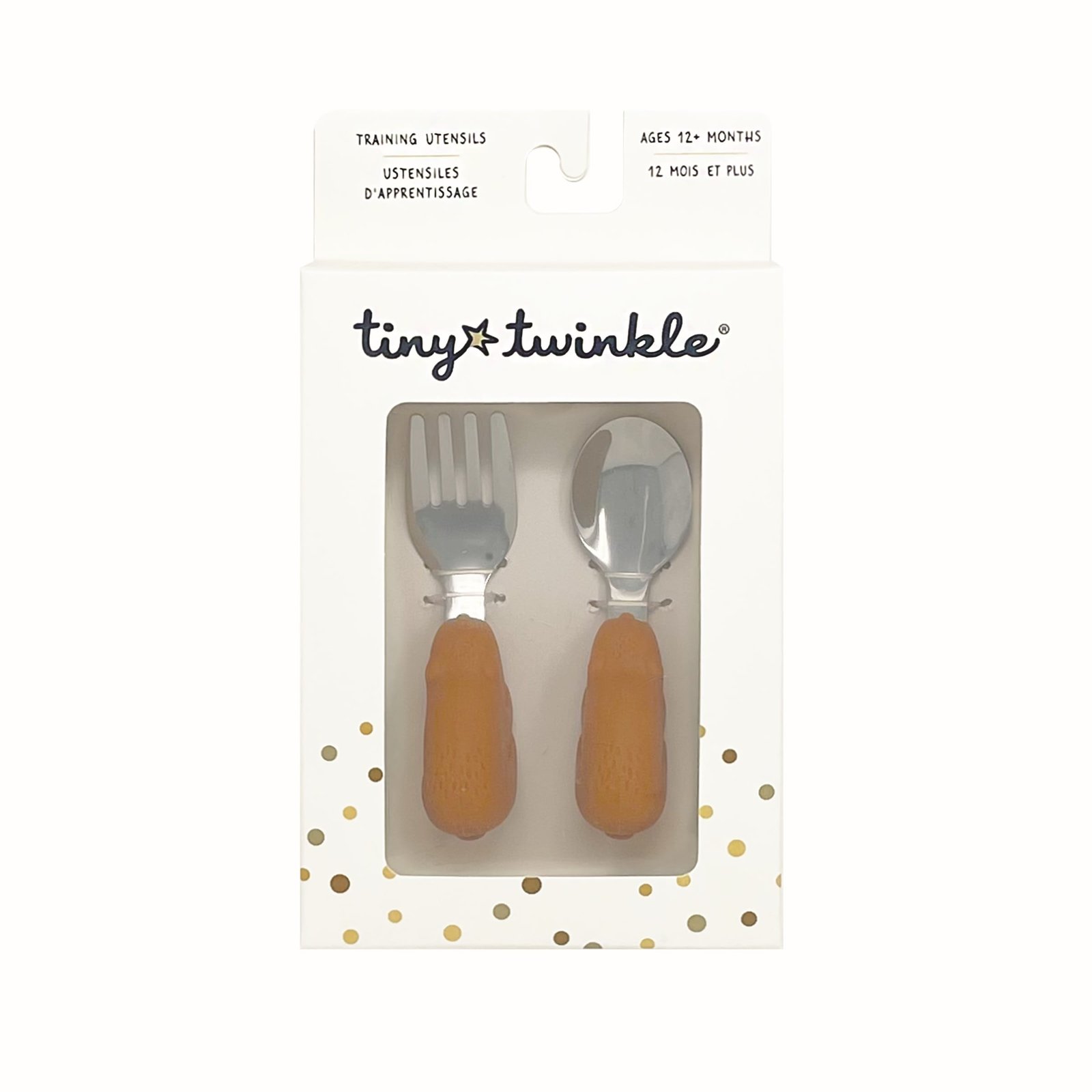 Divertida cuchara y tenedor de acero inoxidable y mango de silicona de la marca Tiny Twinkle. Los cubiertos son texturizados, antideslizantes y fáciles de agarrar. Por su tamaño y la forma promueven la autoalimentación. El tenedor con sus púas redondeadas son seguras y la cuchara es profunda.