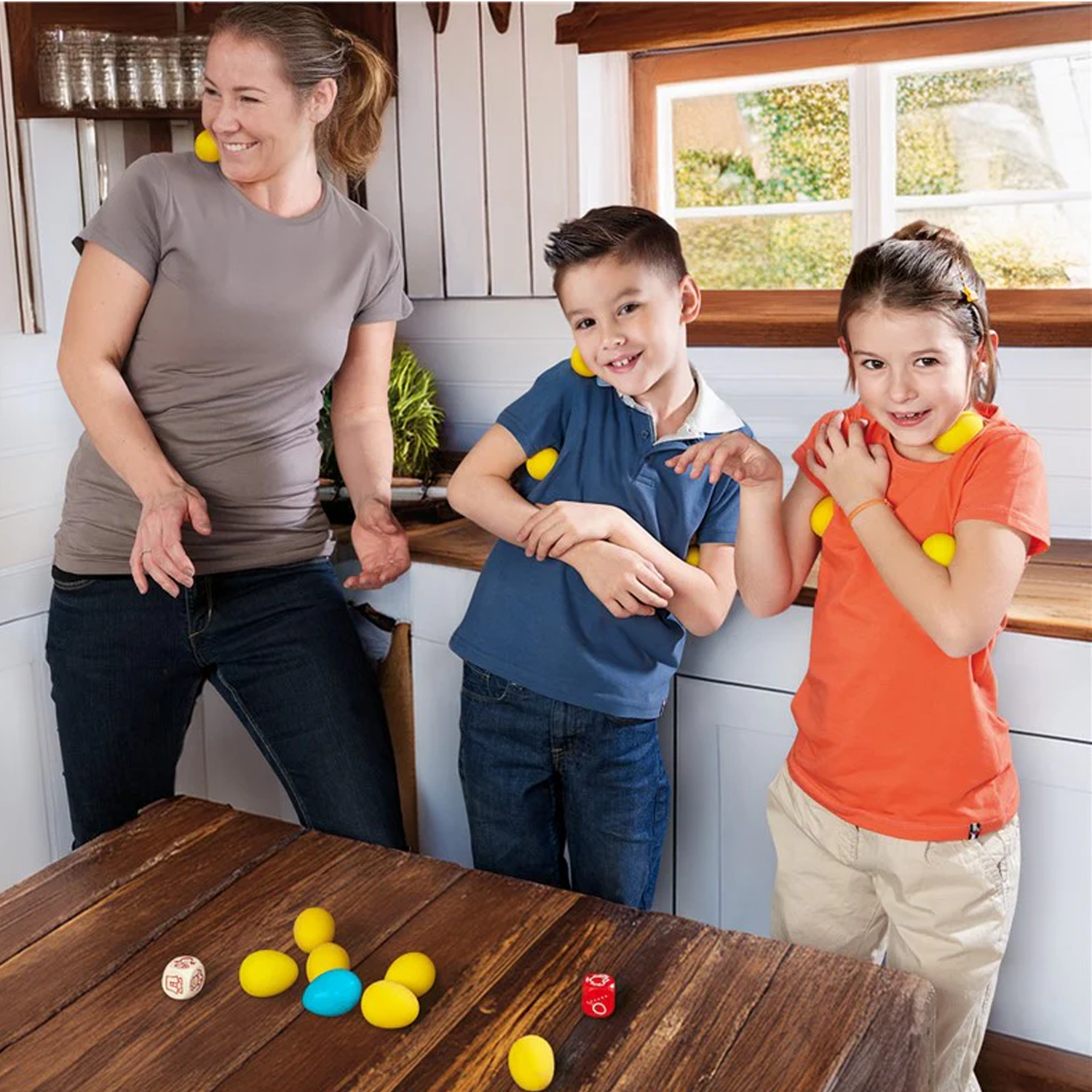 Este juego de destreza y habilidades corporales es perfecto para disfrutar en familia. Con 9 huevos de goma y un huevo de madera, cada partida es única y llena de risas. A medida que avanza el juego, la tensión crece mientras los jugadores intentan equilibrar los huevos en sus cuerpos sin perder el control. ¡Diversión asegurada para todos!