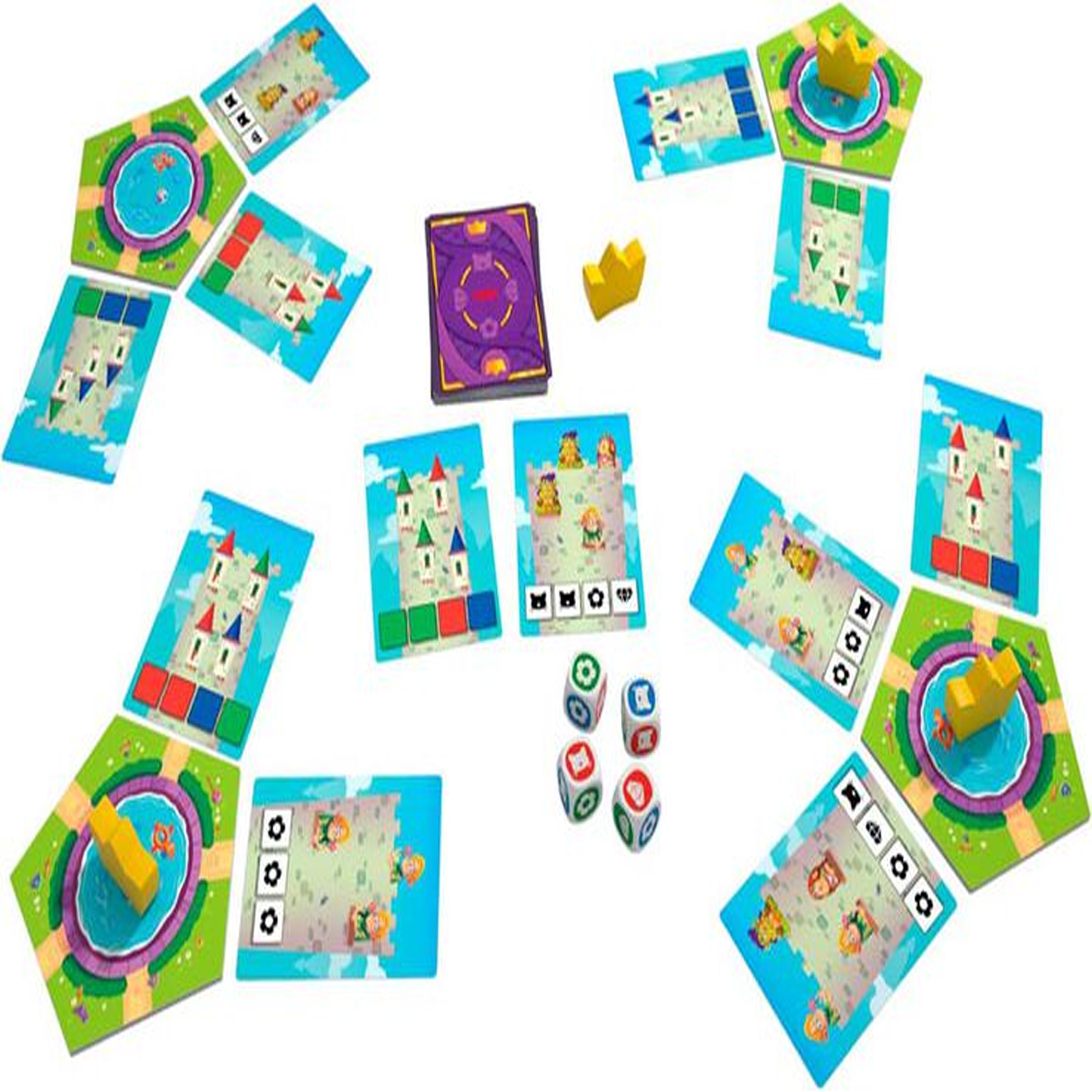 ¡Hurra! Se va a coronar a un nuevo Rey de los Dados. Por eso tenéis que construir lo más rápido posible un gran castillo con muchas torres y habitantes. Tira los dados y observa el resultado. ¿Cumple las condiciones de alguna de las cartas de torres, como colores o símbolos? ¡Genial! La carta es tuya y la puedes poner en tu jardín. ¿No cumple todas las condiciones? No te preocupes, tienes otro intento y si no, el turno pasa al siguiente. Quien consiga 5 cartas antes que nadie ¡gana la partida!