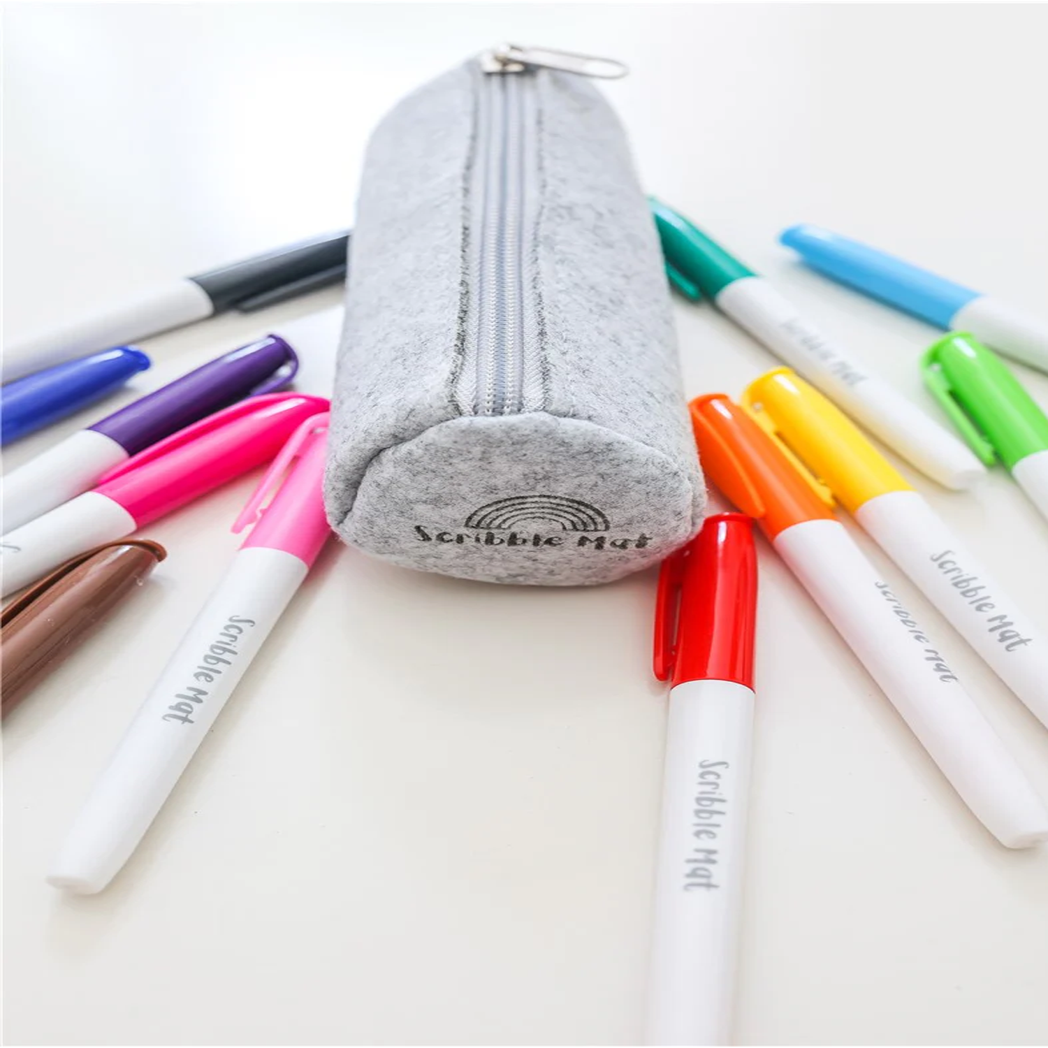 Vienen organizados en un estuche de fieltro gris elegante y práctico, ideal para llevar a cualquier parte o mantener tu zona creativa ordenada. Son la herramienta perfecta para pequeños artistas con grandes ideas.