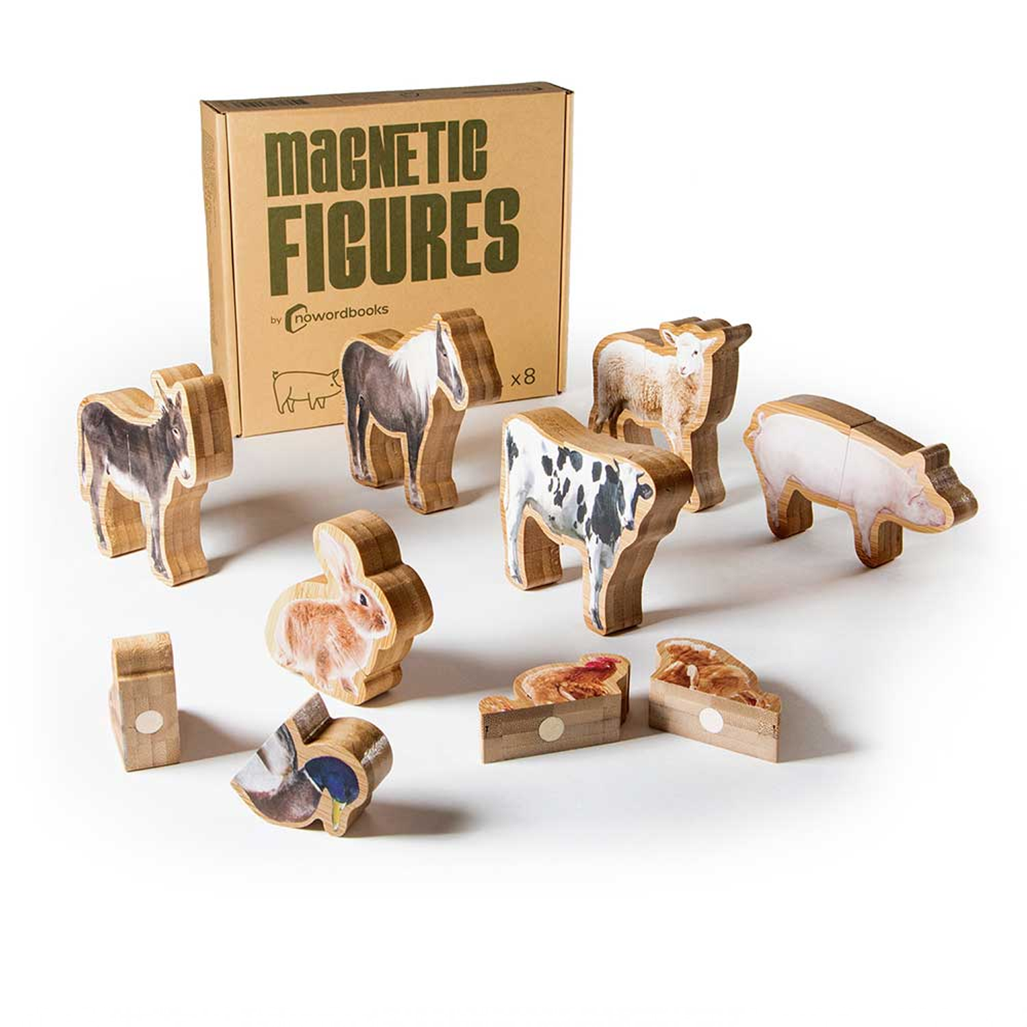 Colección de 8 figuras de animales magnéticos de granja realizadas con fotografía impresa sobre madera de bambú de 2cm de grosor. La imagen está impresa por ambas caras de la figura.