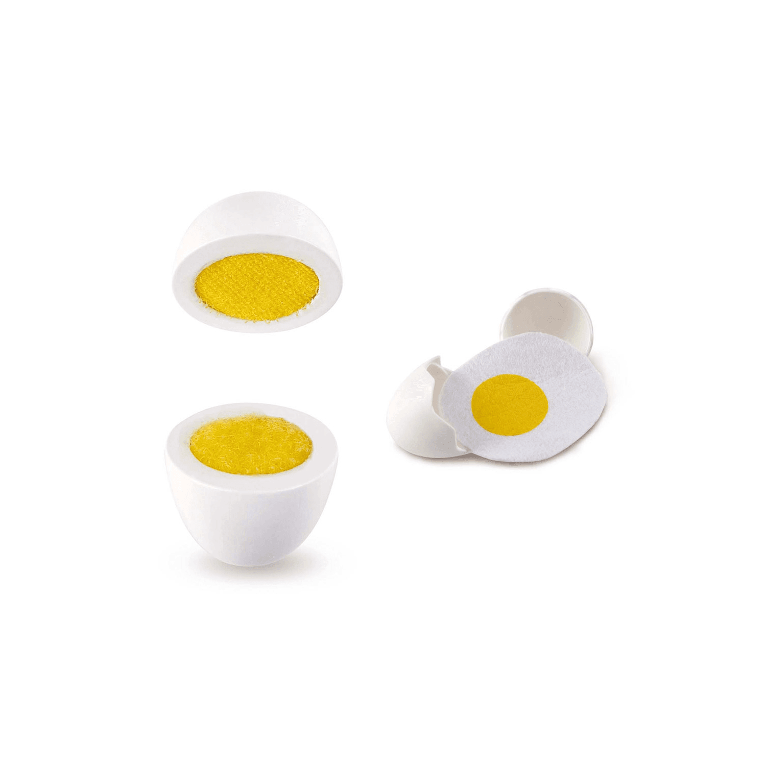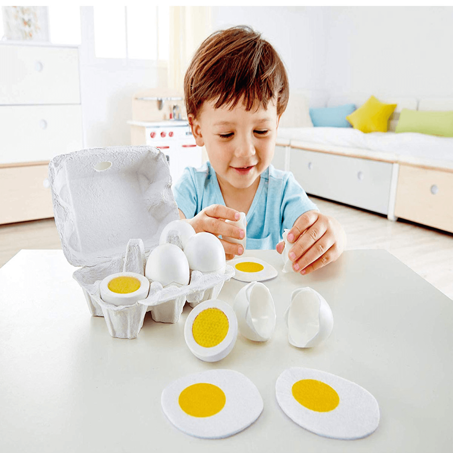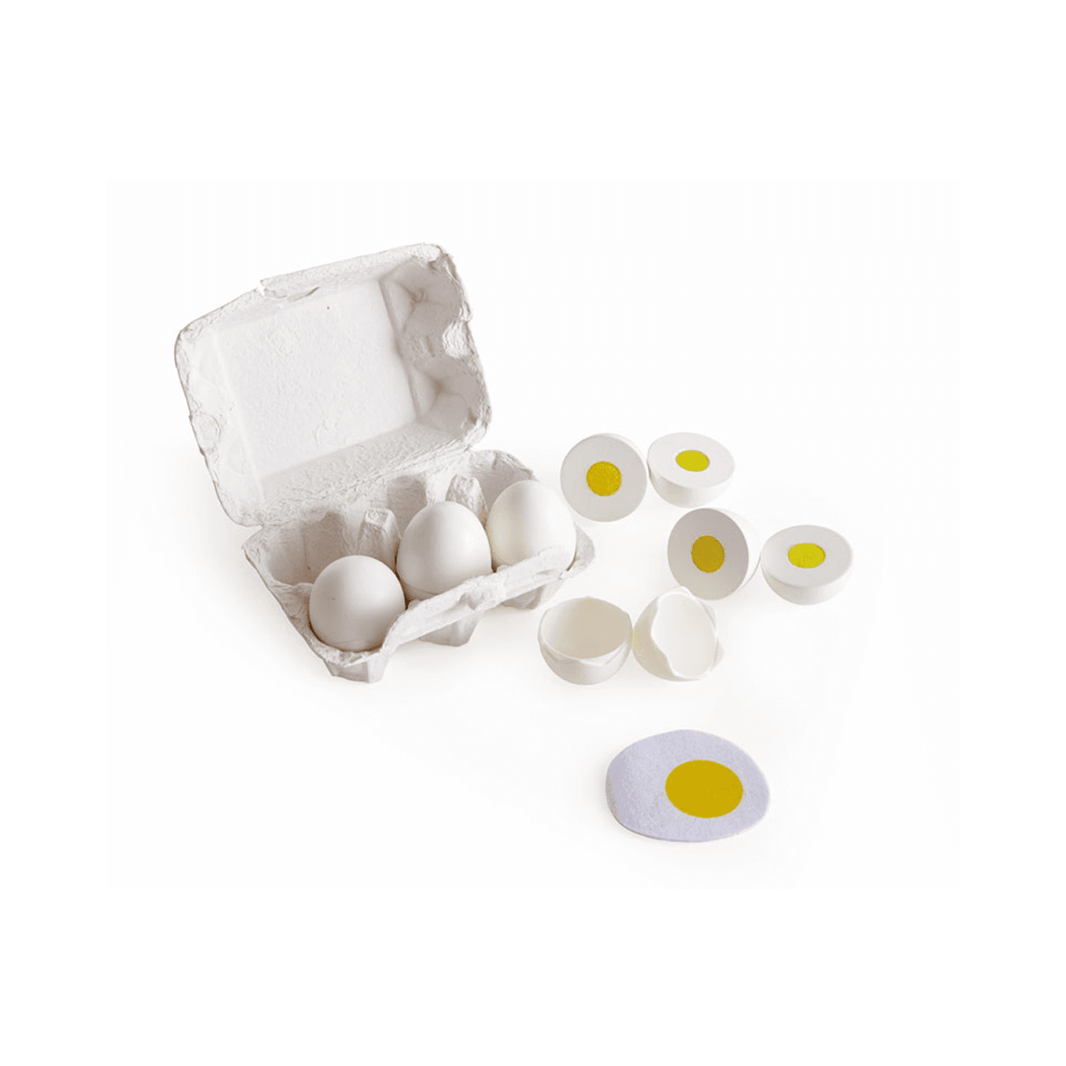 En esta huevera encontrarás 6 huevos: 3 cocidos y 3 fritos. Las cáscaras se pueden abrir para que el juego sea más realista.