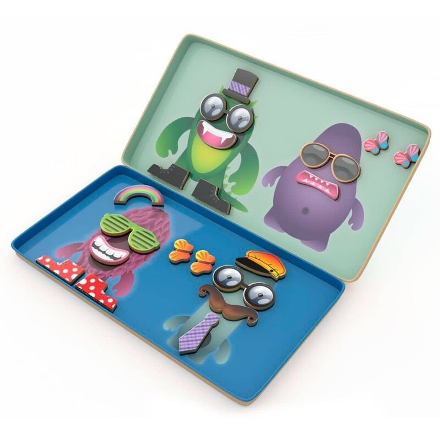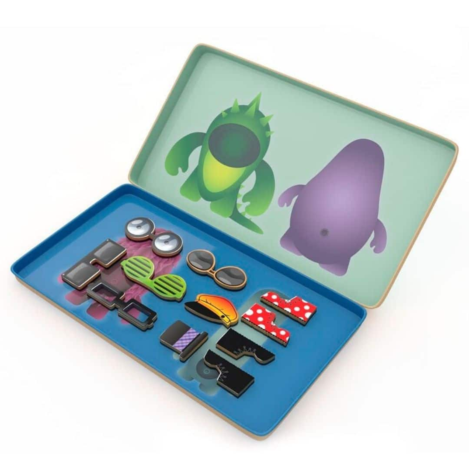 Incluye: 34 fichas magnéticas con partes del cuerpo, ropa y accesorios de monstruos, todo guardado en una práctica lata que sirve de tablero doble.
