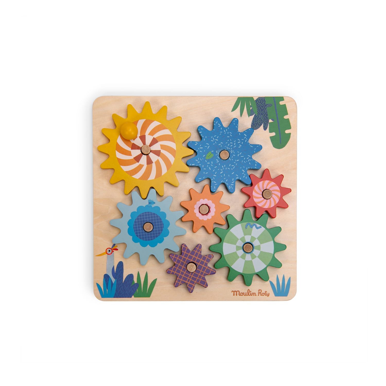 Coloca de manera correcta las piezas de este engranaje para que todo en juguete gire formando paletas de colores.