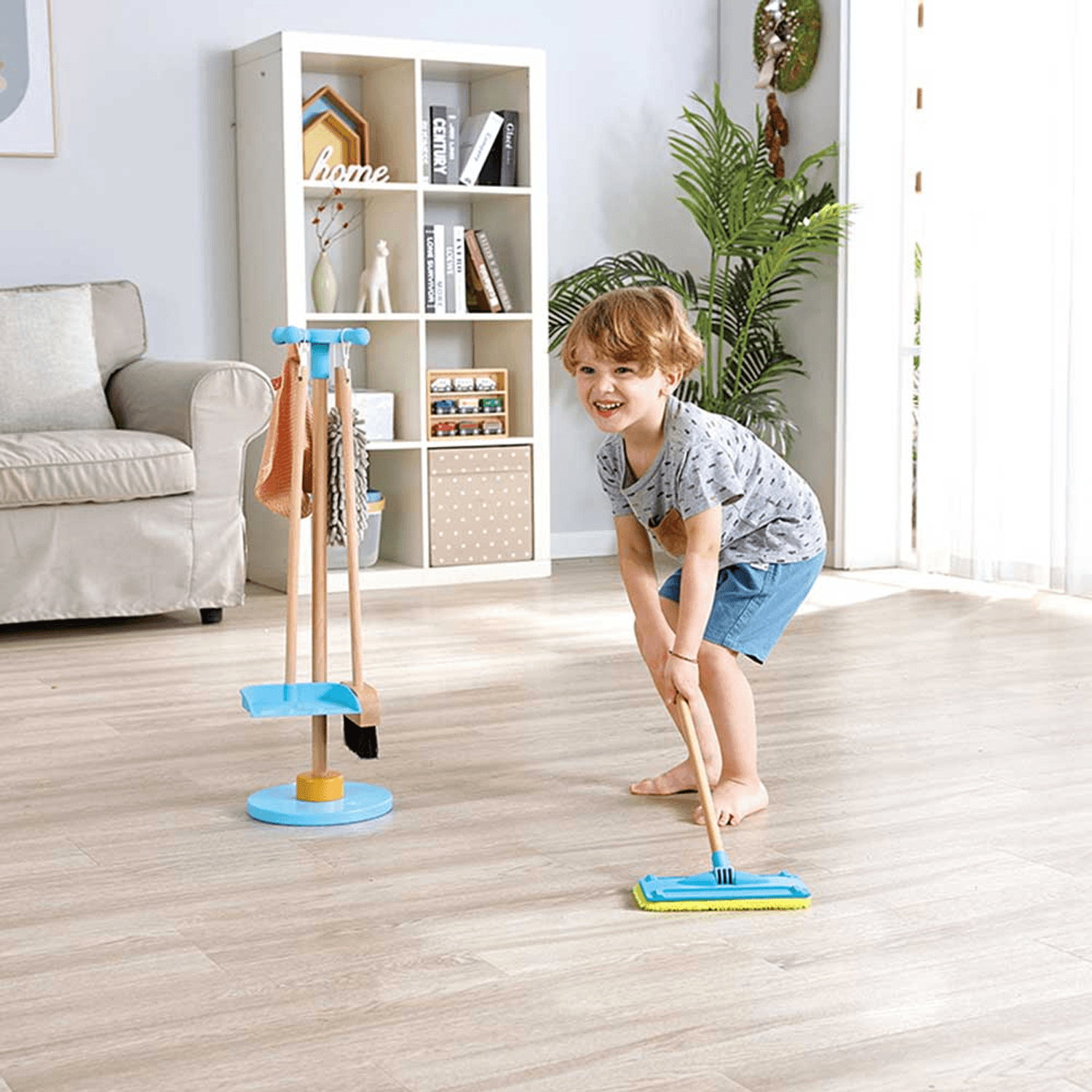 Incluye: una escoba, una mopa, un recogedor, un plumero, una bayeta y un soporte para almacenar el equipo.