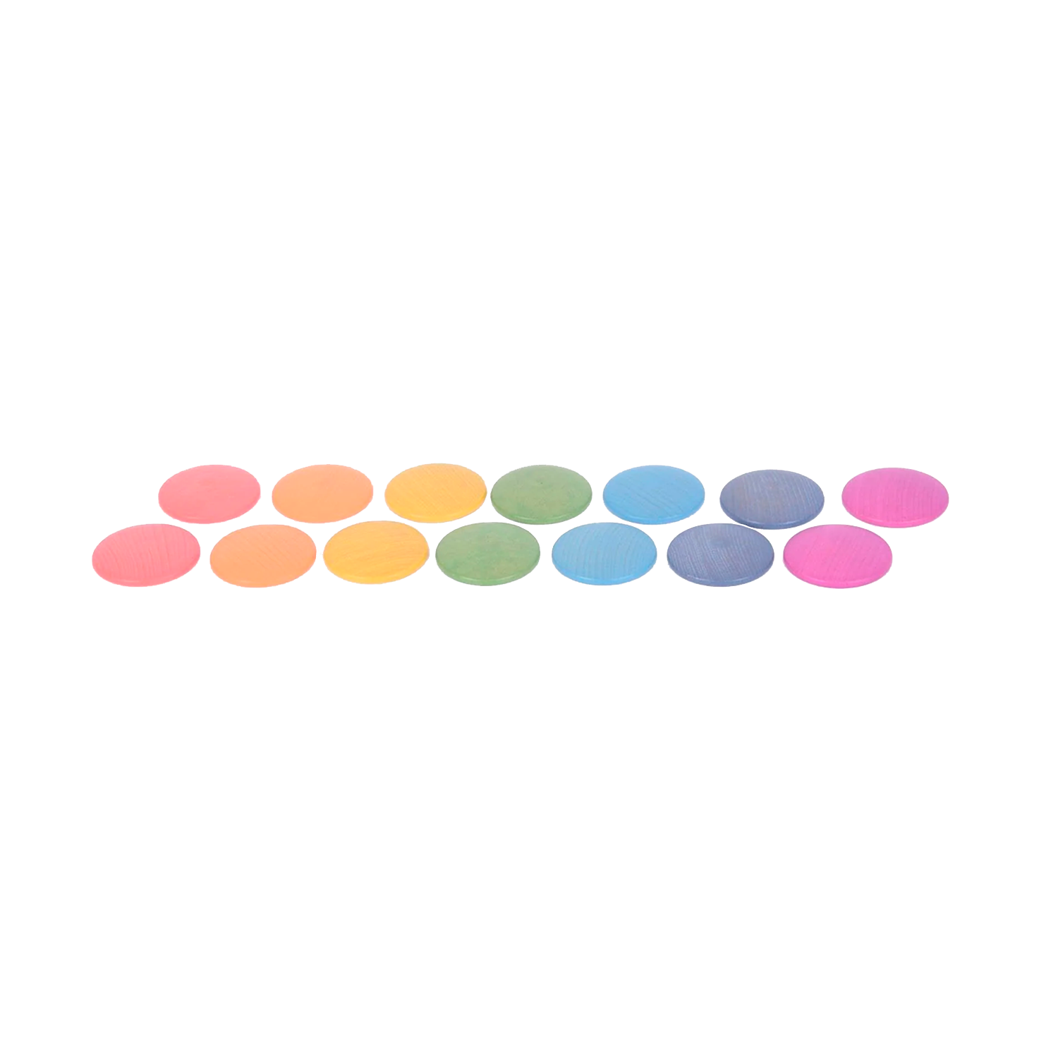 Conjunto de monedas de madera teñidas en los colores del arco iris y de textura suave y lisa.