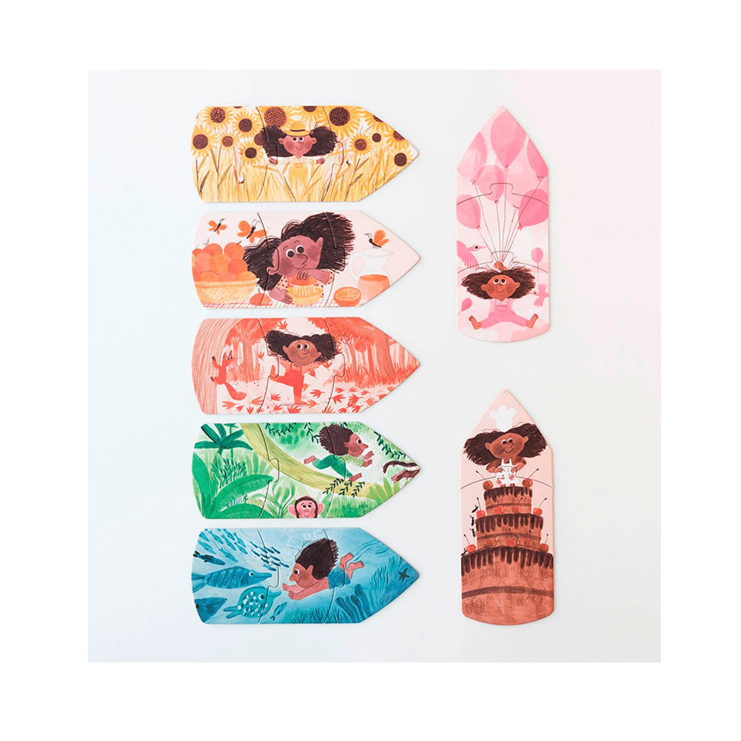 Son 7 puzzles en forma de pinturas de colores con divertidas ilustraciones en el anverso.