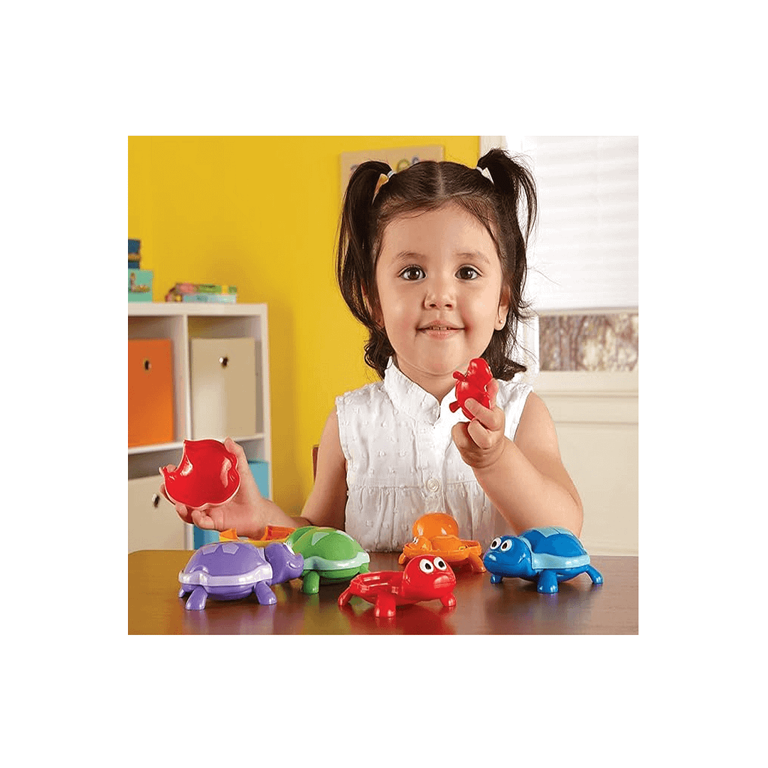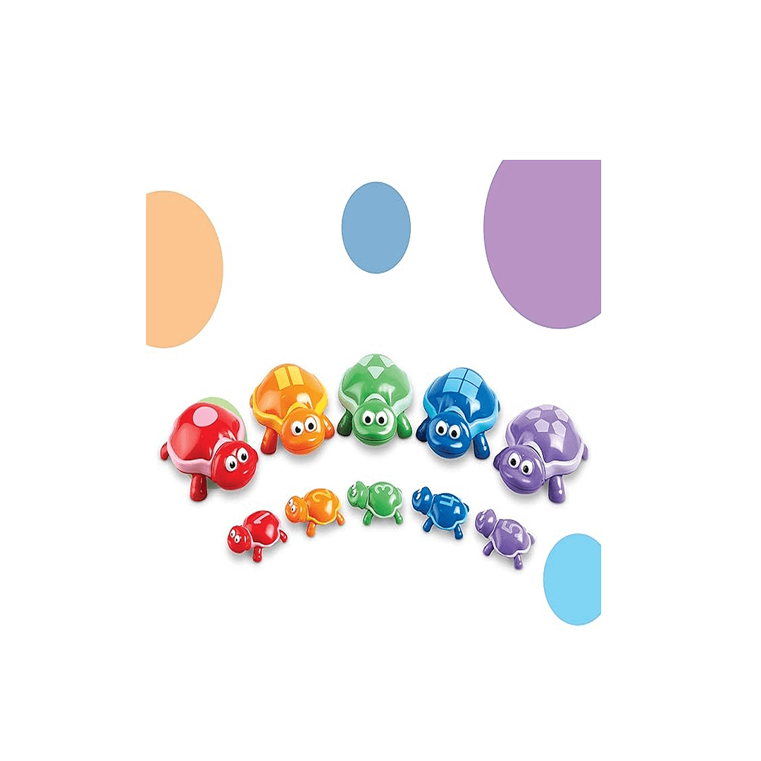 Está compuesto por varias tortuguitas mamás y sus bebés. En sus caparazones llevan grabados números y símbolos que tendrán que emparejar. Tendrán que emparejarlas según su color, símbolos y número de sus conchas.