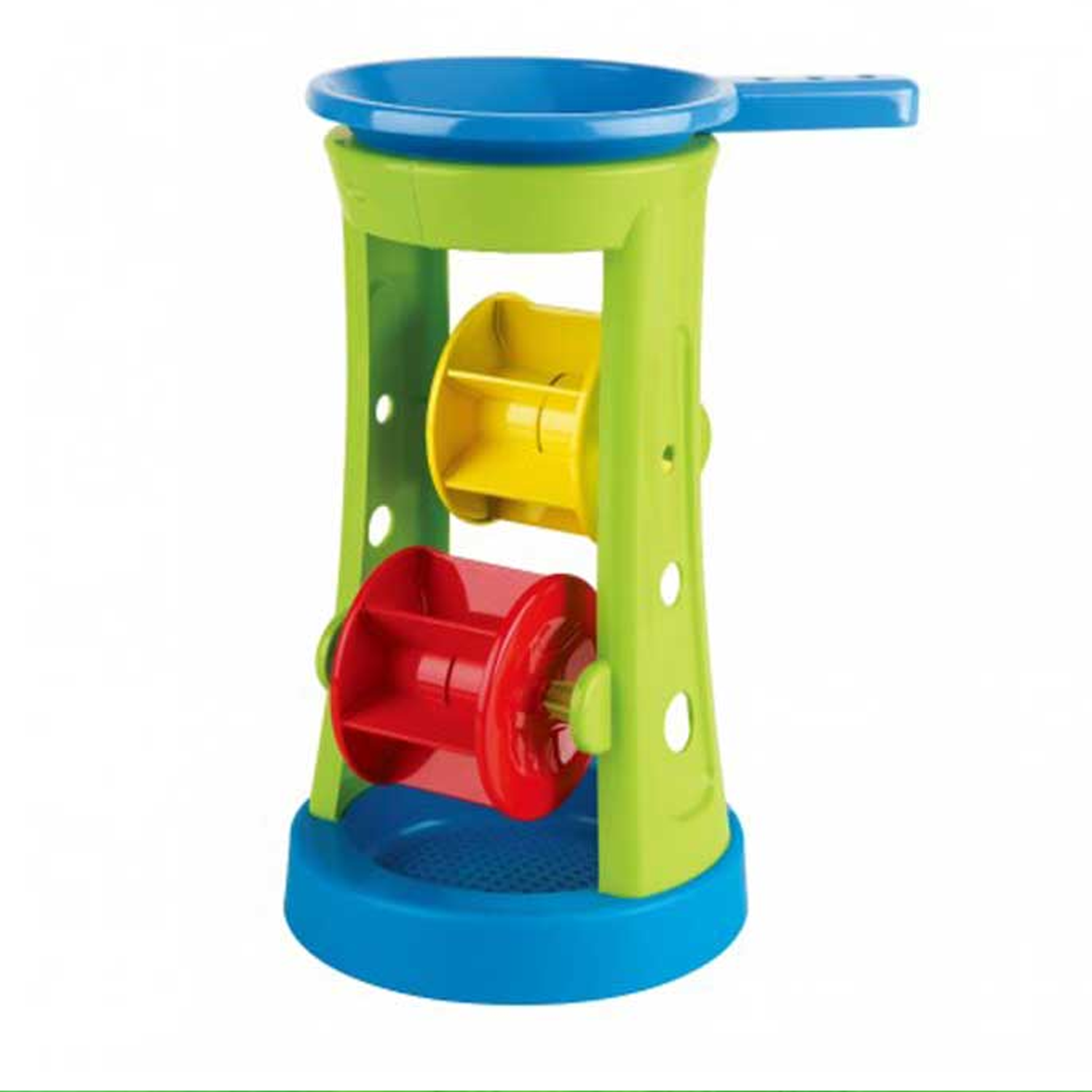 Y más si lleváis juguetes sencillos como este: un embudo y dos ruedas que giran al caer el agua o la arena.