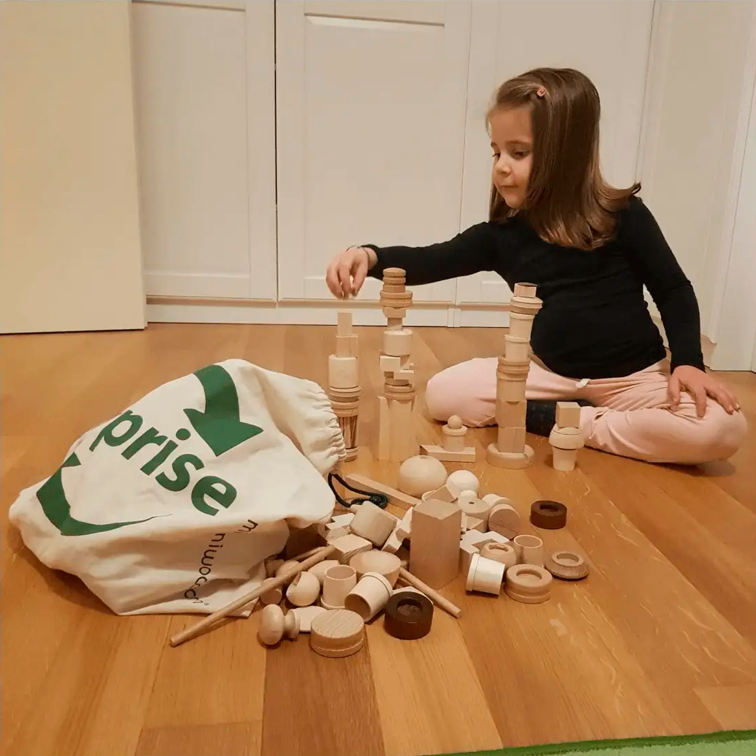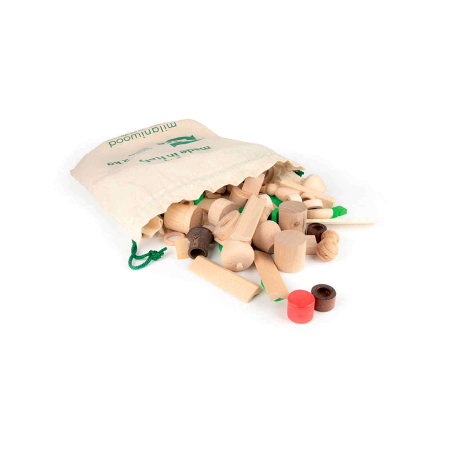 Saco sorpresa de 2kg de piezas de madera para que los peques puedan potenciar su creatividad y jugar a mini mundos.