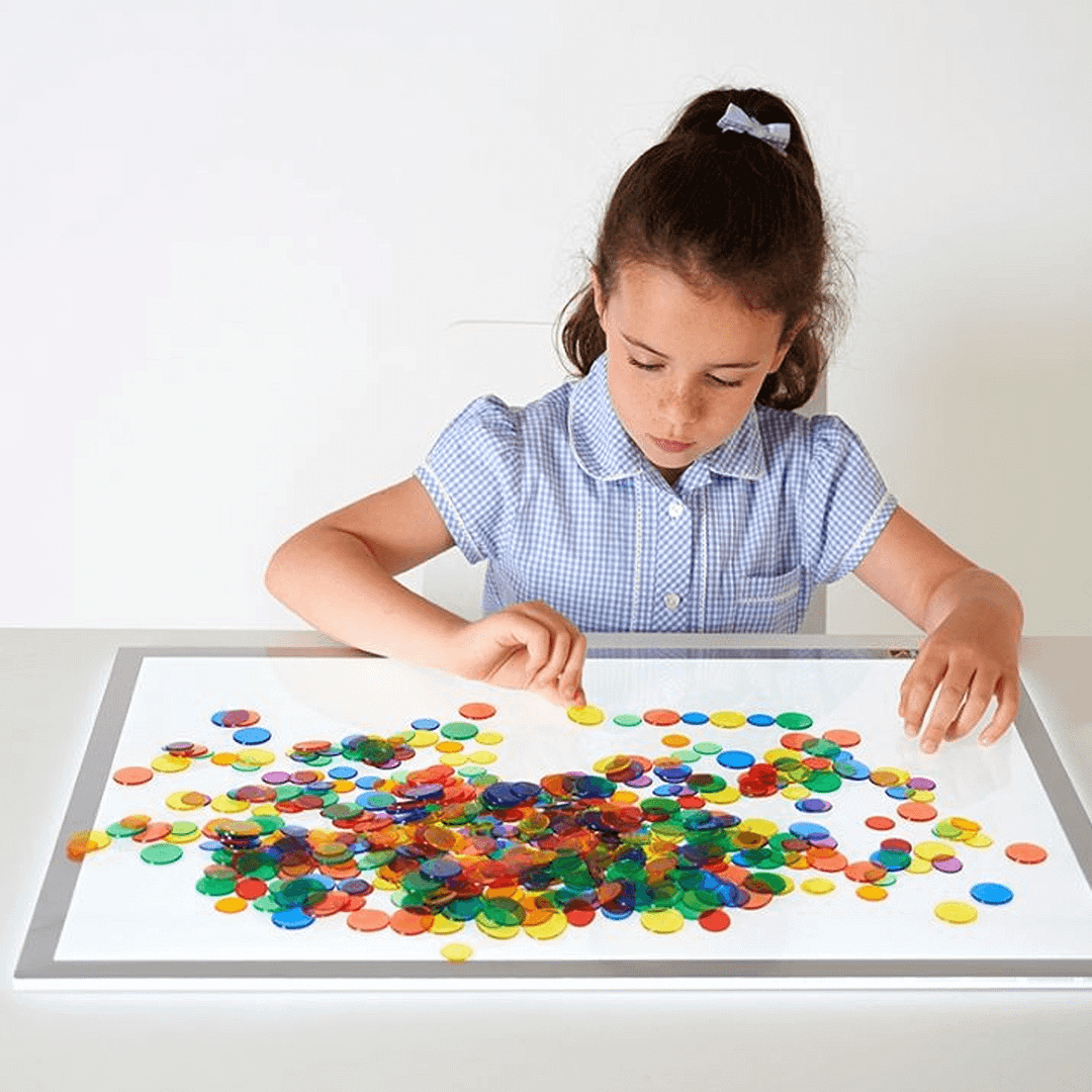 Gracias a su material de colores translúcidos, dejan traspasar la luz por lo que se pueden usar para jugar con las mesas de luz y a superponer colores.