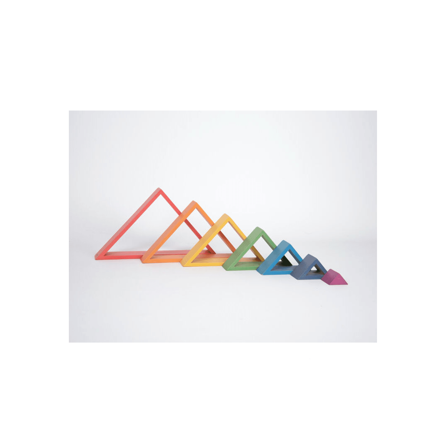 madera de haya maciza lisa con un acabado de vetas de madera natural en los siete colores diferentes del arcoíris. Los triángulos se anidan juntos como un conjunto con el bloque interior como un triángulo 3D sólido. Este conjunto de formas le permitirá a su hijo desbloquear su creatividad e innovación.