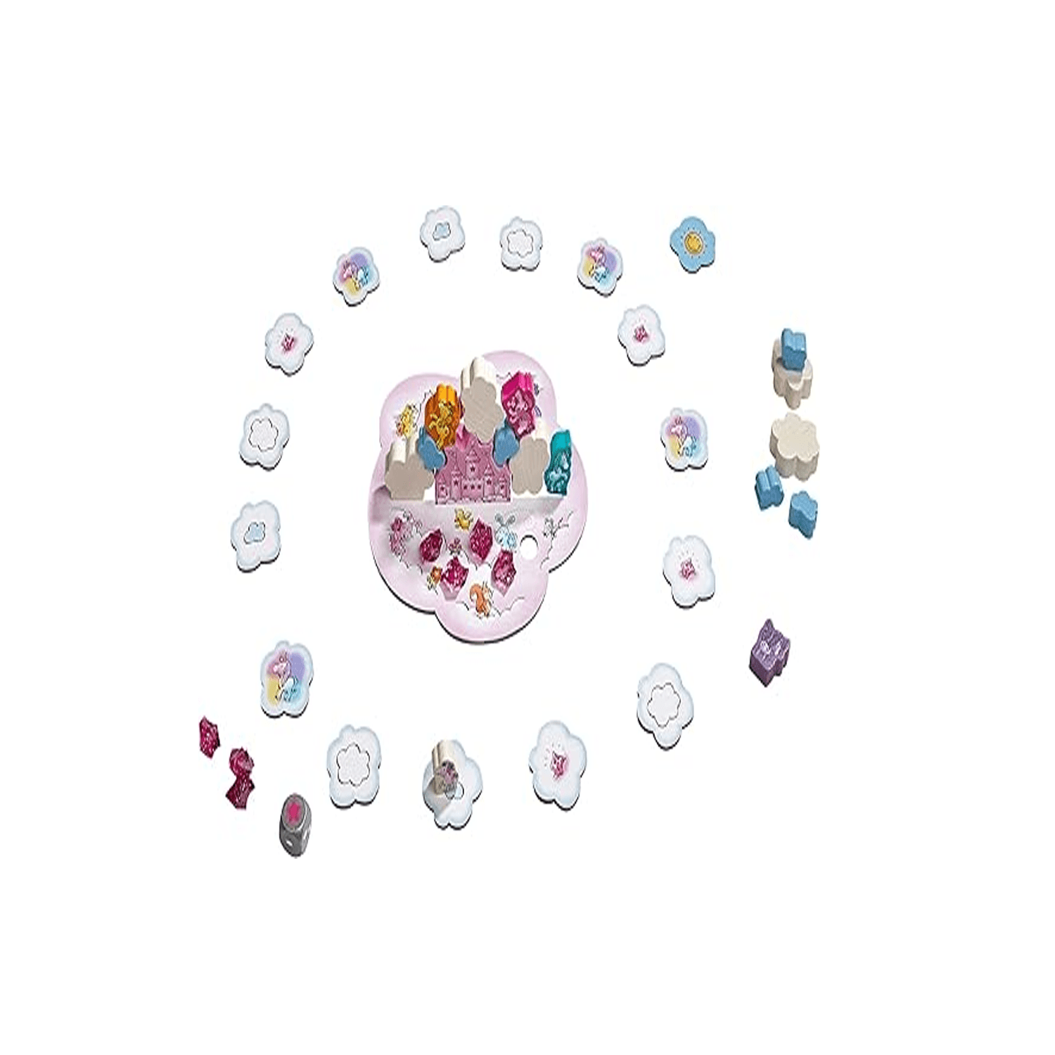 1 tablero de juego.60 cristales de nubes.2 dados de madera: rosa y azul.4 unicornios: Destello de color rosa, Astro de color amarillo, Flor de color lila y Espiral de color turquesa.Instrucciones del juego sobre los preparativos, el desarrollo y los pasos a seguir y el final del juego.