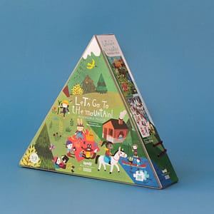 Vamos a la montaña es un puzzle reversible de 36 piezas de Londji. En una cara nos deslizaremos por la montaña helada en invierno, en la otra nos zambulliremos en los meses de verano.