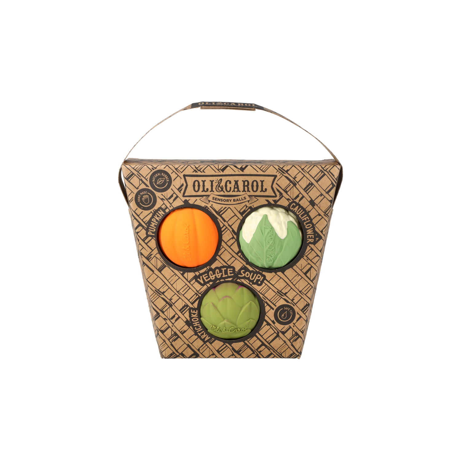 ¡Diversión verdulera! El set Veggie Soupe incluye tres mini pelotas sensoriales: nuestras superventas, la alcachofa y la coliflor, y nuestra calabaza.