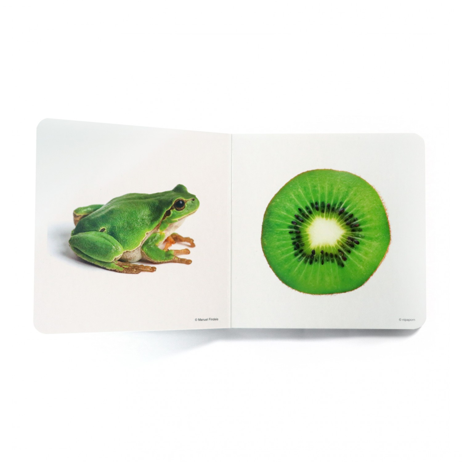 Incluye fotos de animales, frutas y otros objetos cuya característica común es ser de color verde.